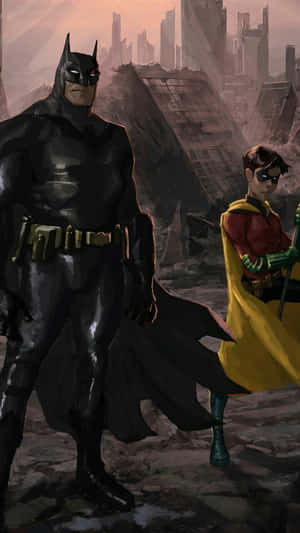 Batman And Robin Standing Tall In Gotham City Wallpaper -