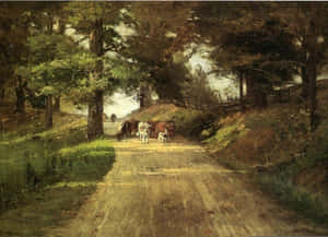 A Painting Of A Country Road With People Walking Down It Wallpaper -