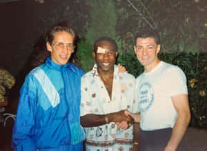 Three Men Shaking Hands Outdoors Wallpaper -