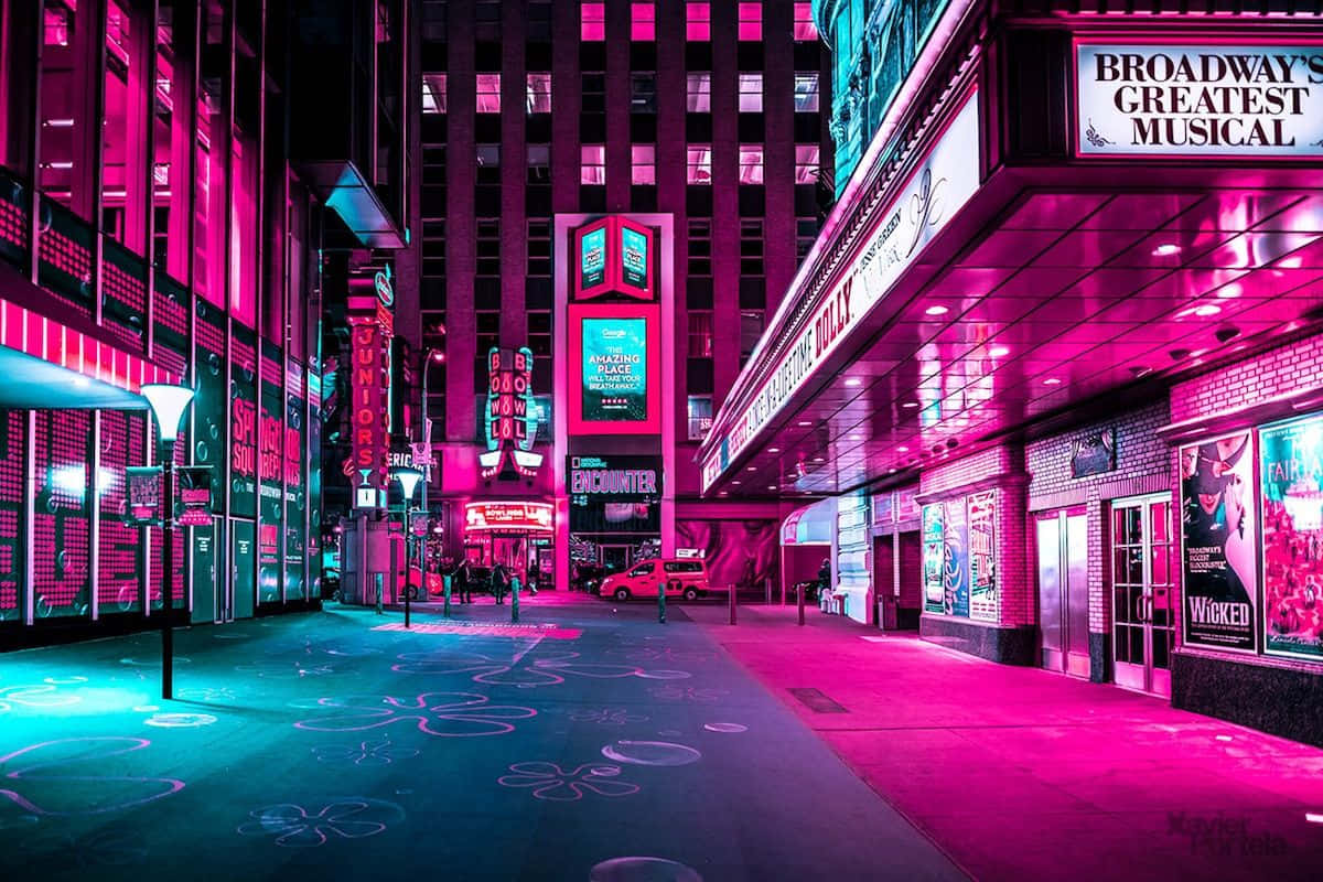 A City Street With Neon Lights Wallpaper
