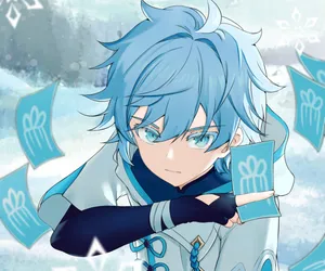 A Character With Blue Hair And Blue Eyes Holding A Blue Card Wallpaper -