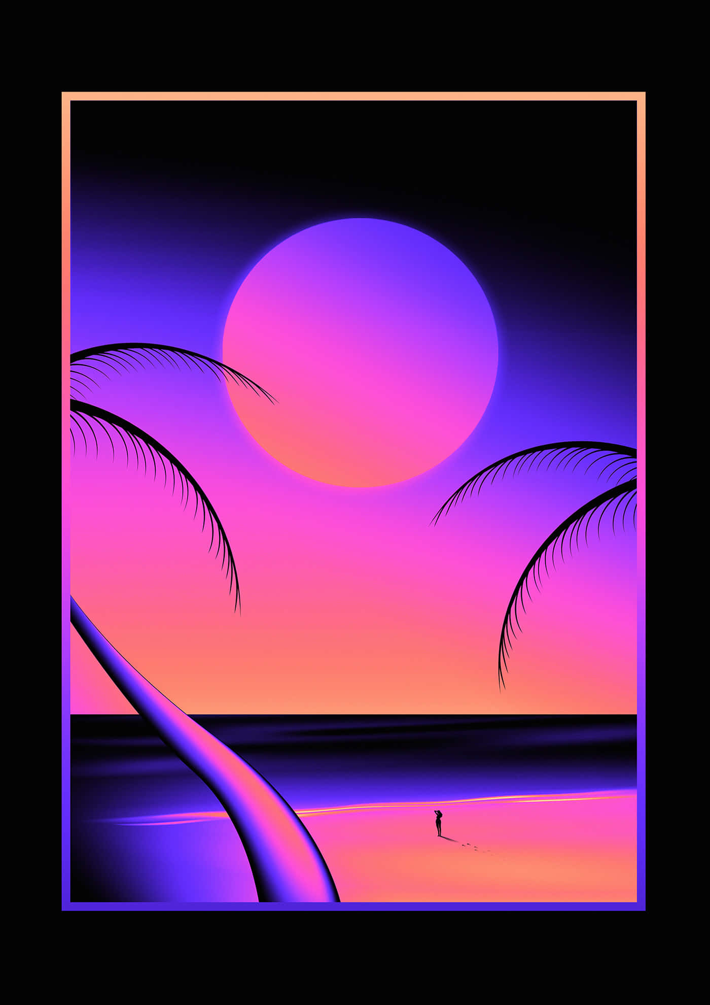 A Painting Of A Beach With Palm Trees And A Sunset Wallpaper