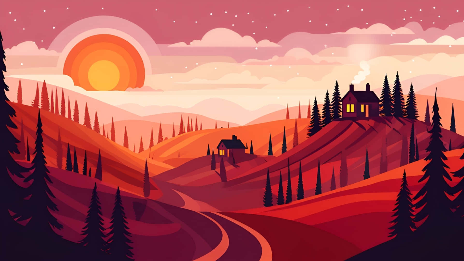 Cartoon Mountain Sunset Landscape Wallpaper