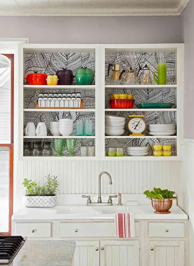 Clean Kitchen Cupboard And Dishes Wallpaper