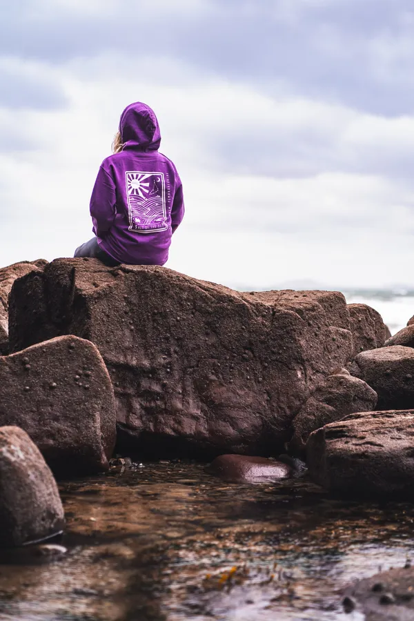 Contemplative Personin Purple Hoodieon Rocks -