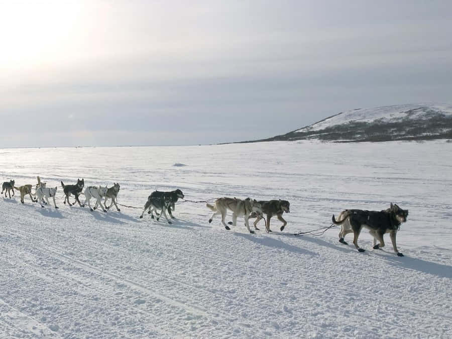A Team Of Sled Dogs On A Snowy Landscape Wallpaper -