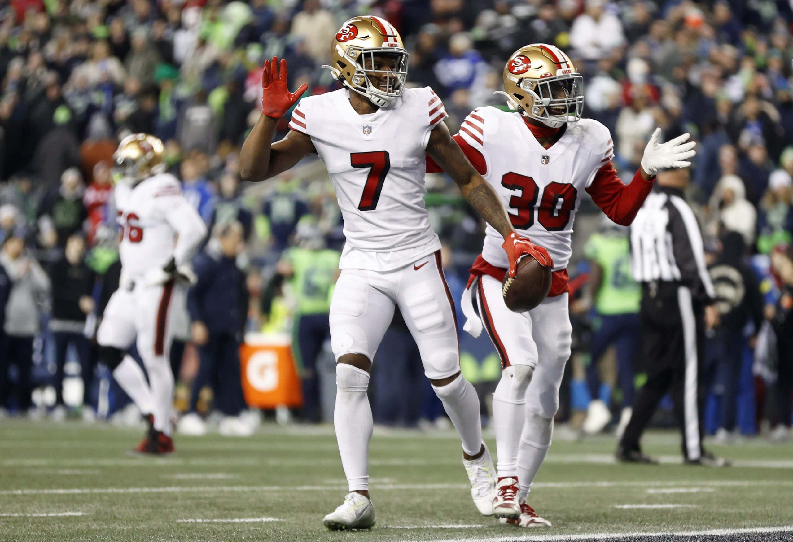 49ers Defensive Players Celebratingon Field Wallpaper -