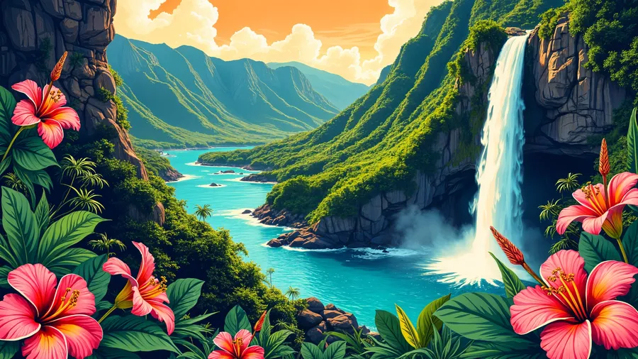 Hawaiian Tropical Waterfall Scene -