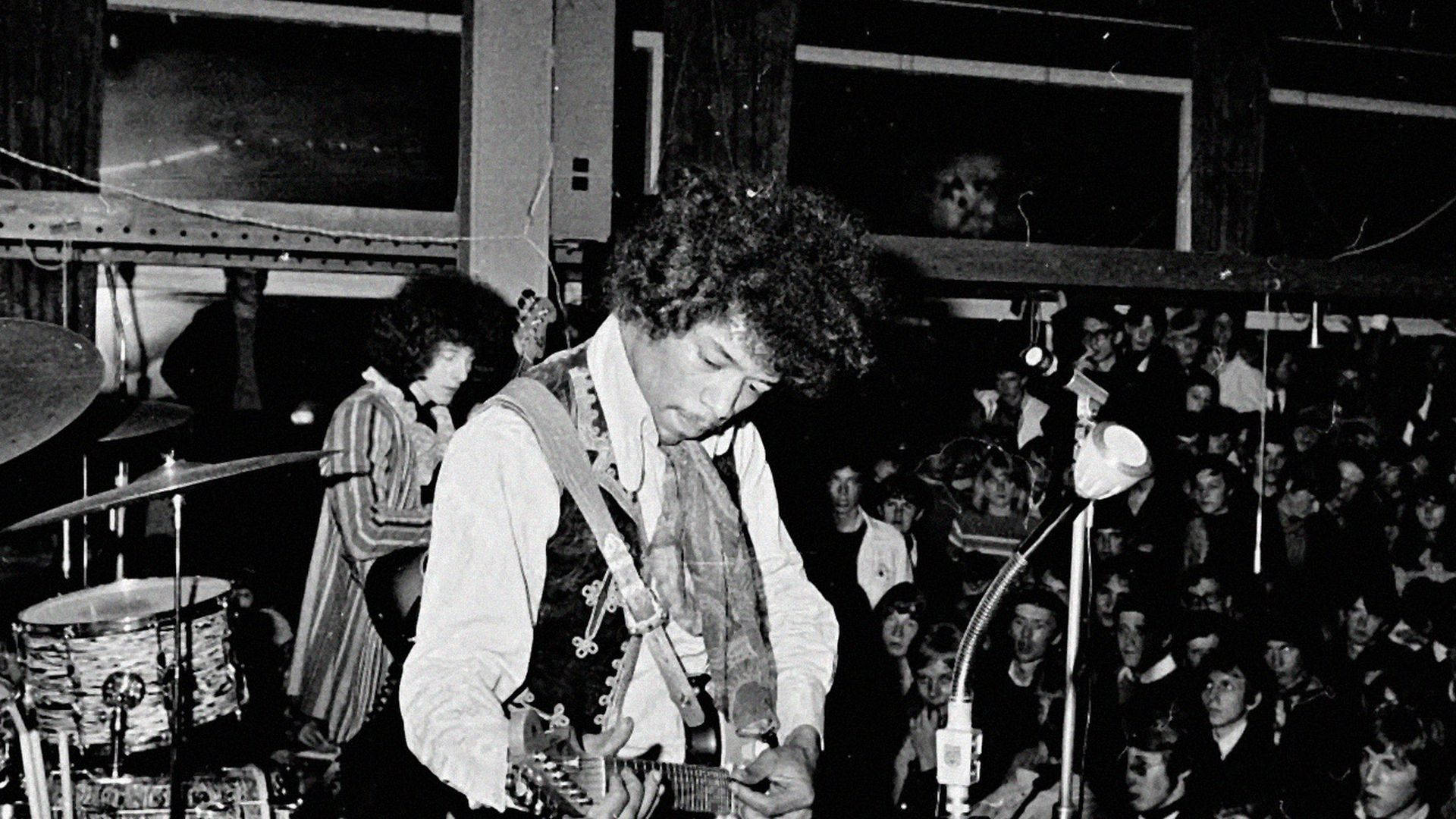 Jimi Hendrix Playing In Front Large Crowd Wallpaper -
