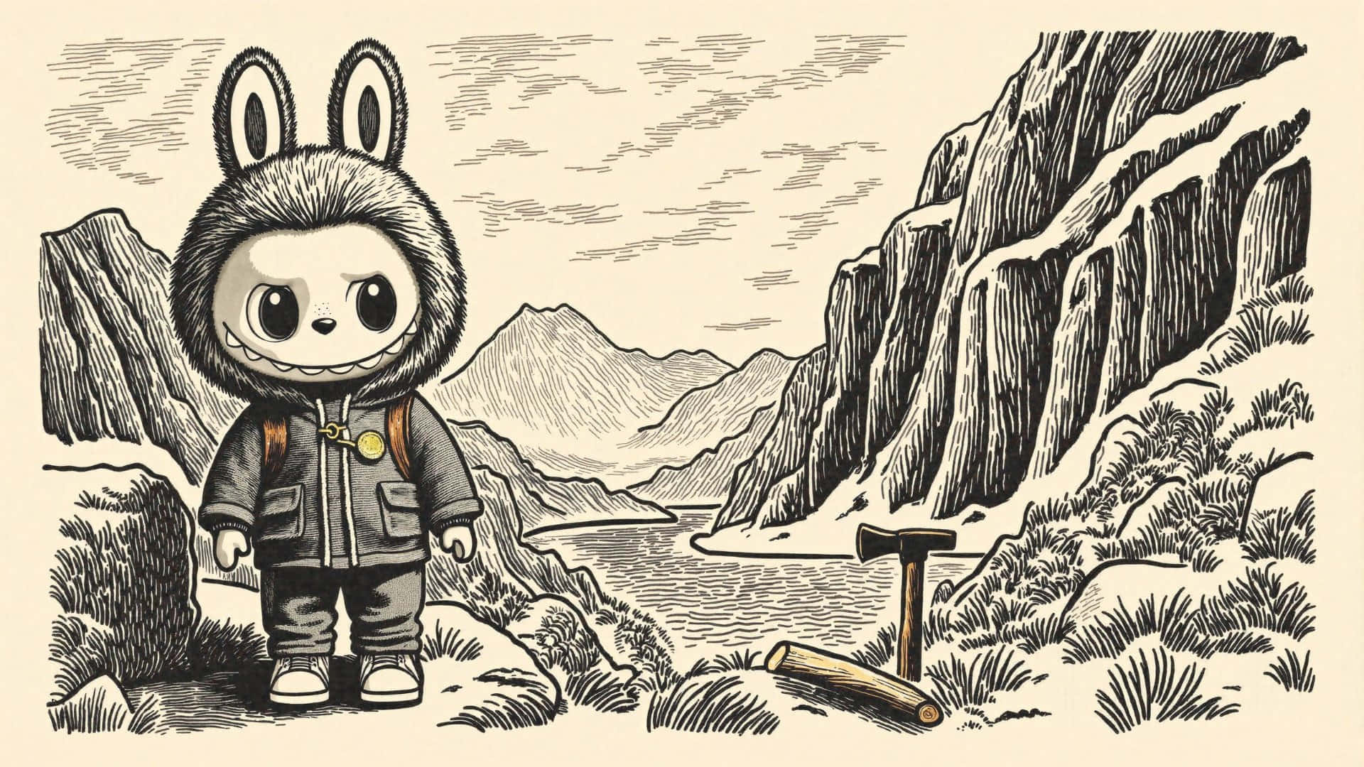 Related Labubu Adventure In Mountain Landscape Wallpaper