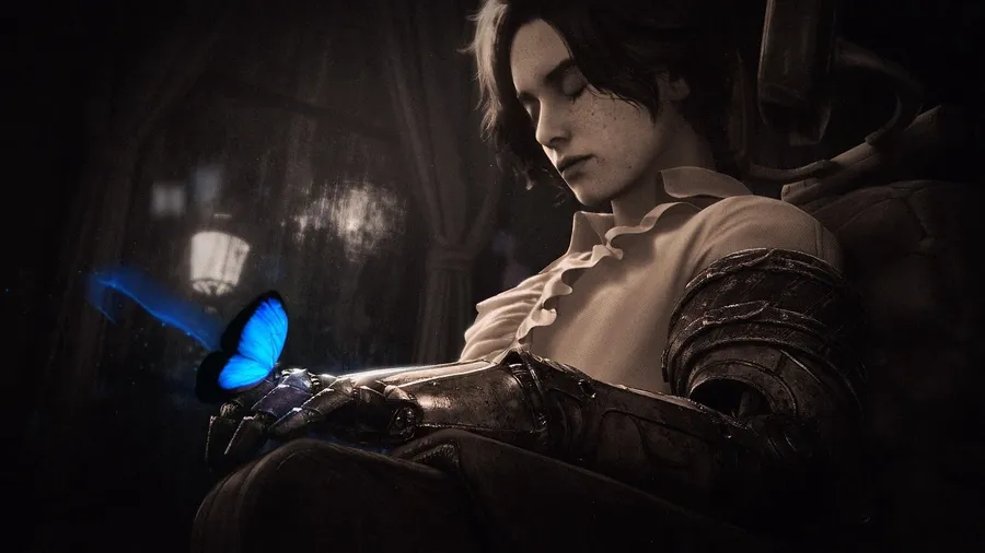 Liesof P Blue Butterflyand Armored Figure Wallpaper