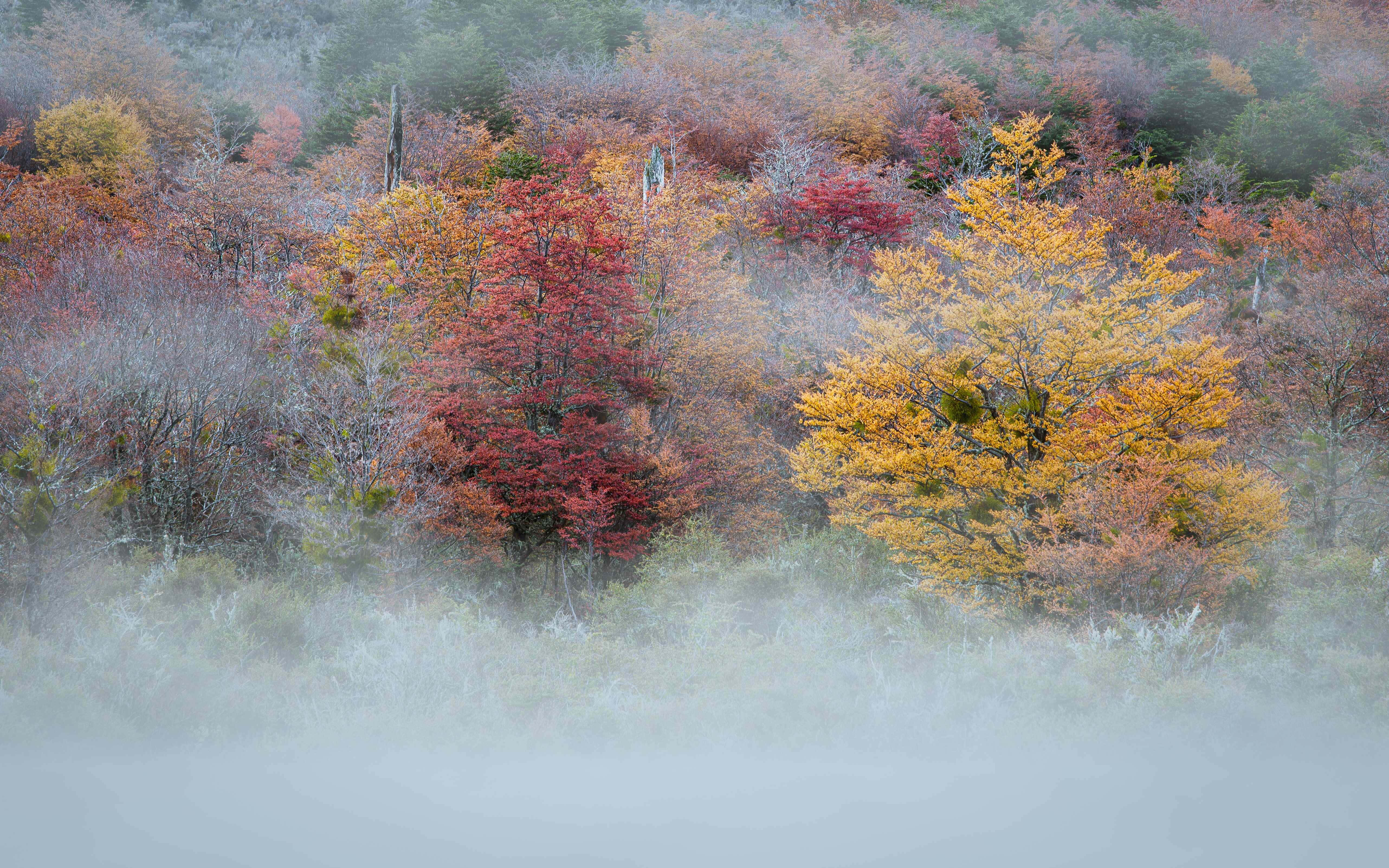 A Mesmerizing Blanket Of Fog Enveloping A Colorful Autumn Forest Wallpaper -