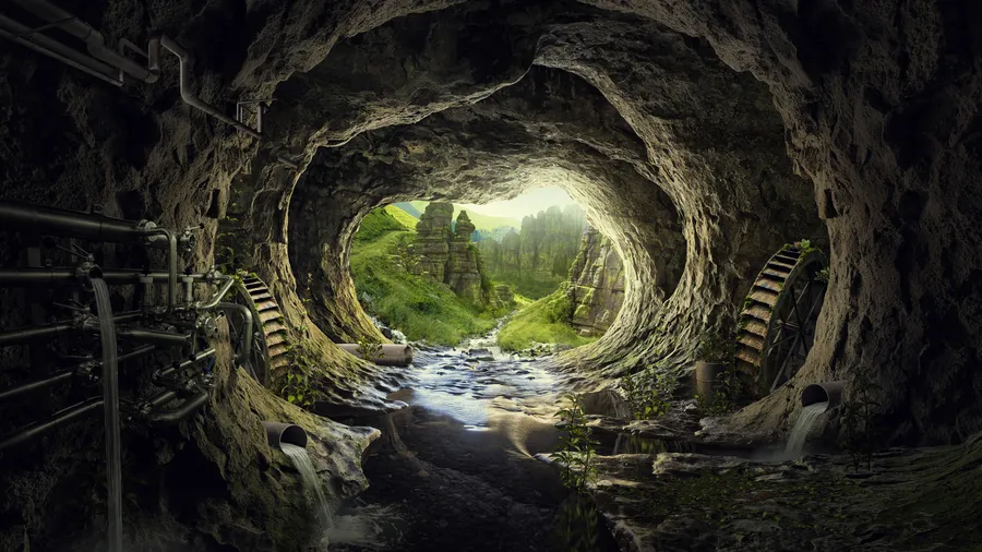 Pandora Waterwheel In Cave Wallpaper