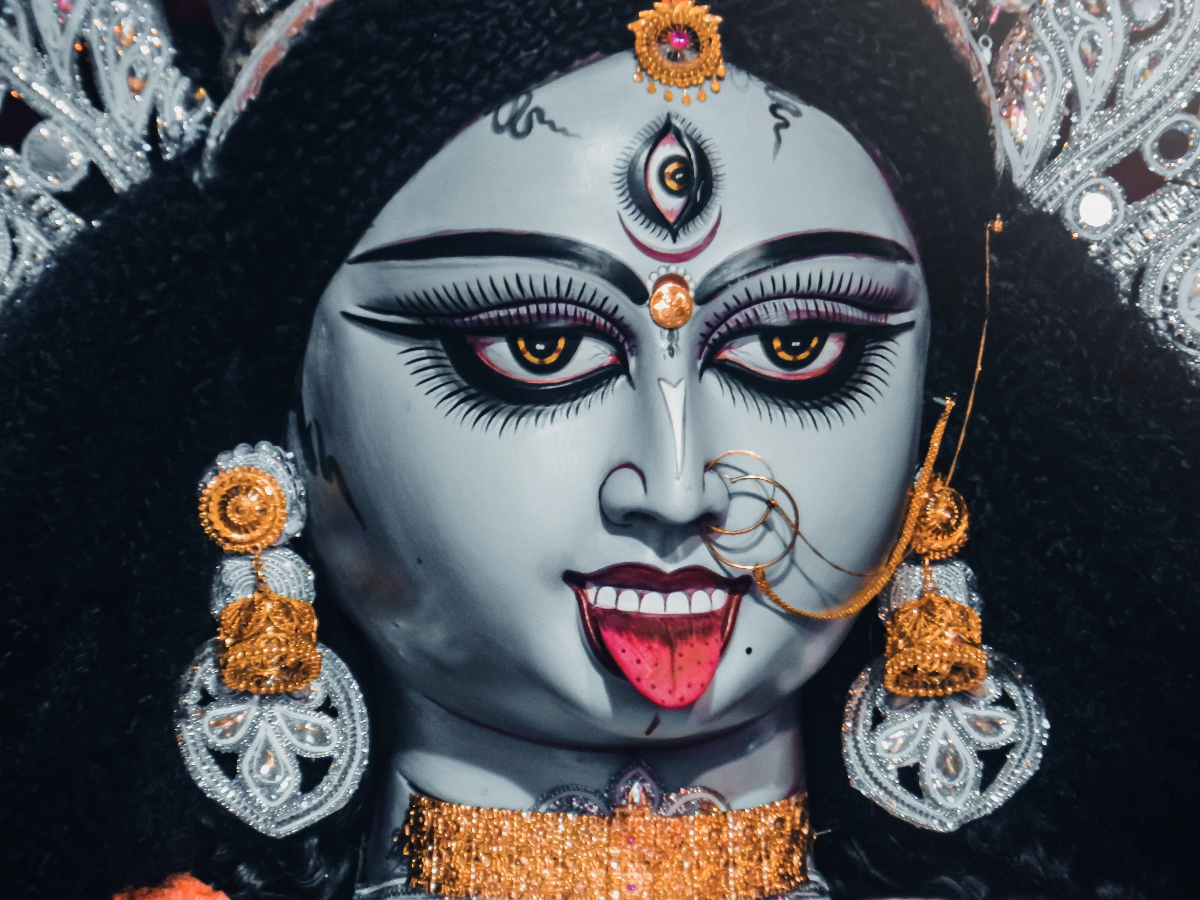 Powerful Divine Representation – Goddess Kali Adorned With Golden Accessories. Wallpaper