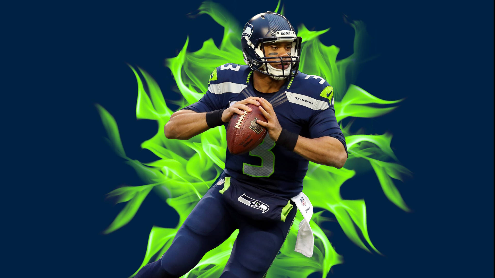 Russell Wilson In Front Of Green Flames Wallpaper