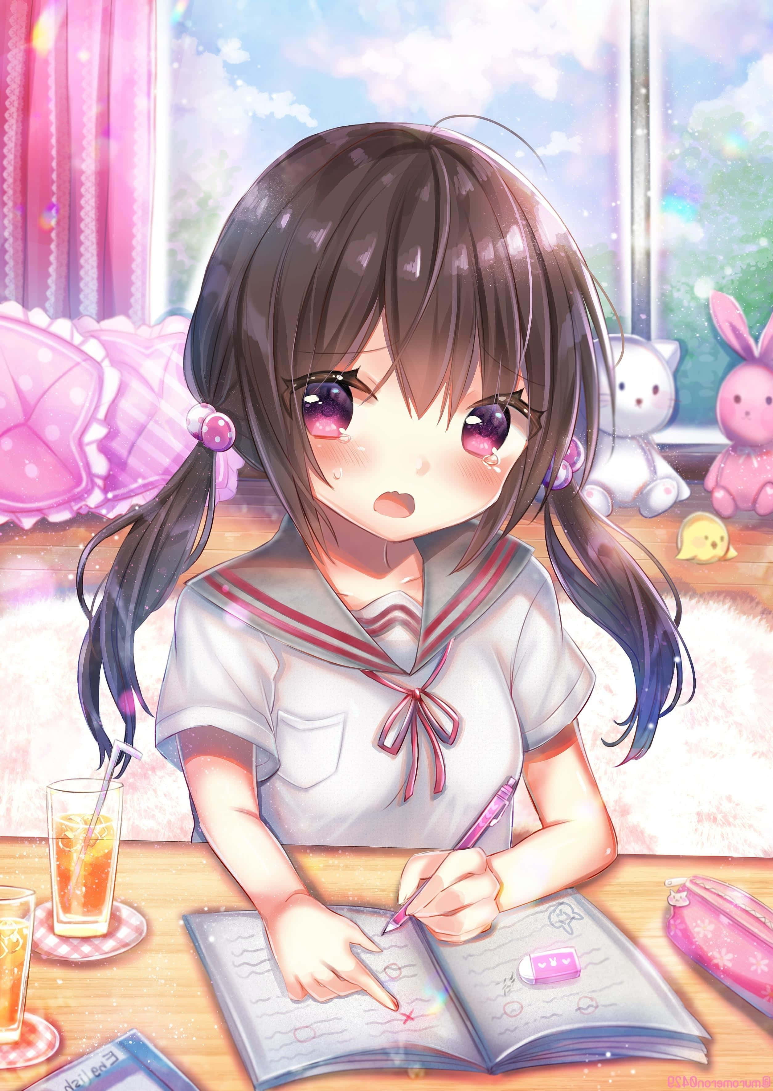 Studious Anime Girlat Desk Wallpaper