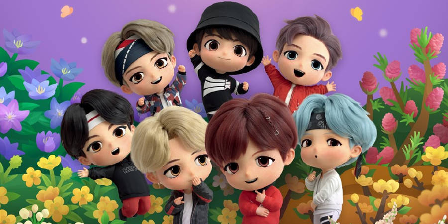 “tiny Tan Bts: Animated Miniatures Of The Bangtan Boys In A Vibrant Plant Setting” Wallpaper