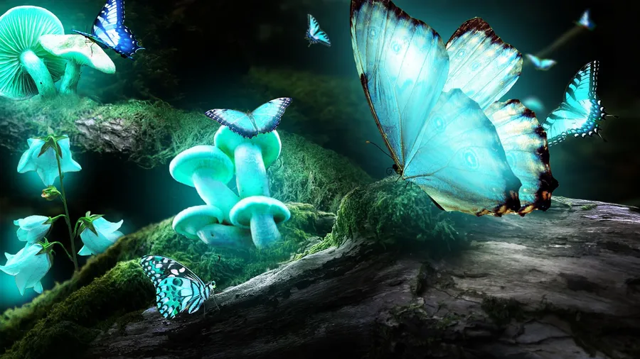 Related Turquoise Night Butterfly And Mushrooms Wallpaper