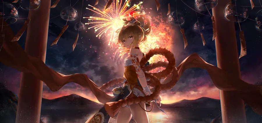 Yoimiya Holding Fireworks Wallpaper